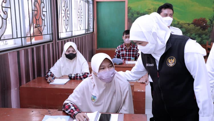 TIMES Salatiga/Gubernur Khofifah saat meninjau PTM terbatas. (FOTO: Dok.Humas Pemprov Jatim)
